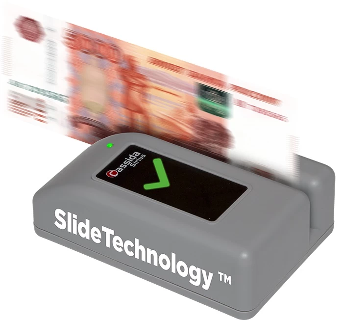 Для того чтобы проверить купюру на Cassida Sirius вам необходимо просканировать банкноту проведя её через детектор в определенном положении, обозначенном на лицевой стороне аппарата. В момент прохождения банкноты детектор с помощью лазерного луча анализирует наличие антистоксовой (ИК) метки, расположенной на определенной части банкноты. После прохождения проверки на экране детектора появиться графическое сообщение о положительном или отрицательном результатах проверки.